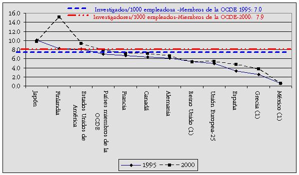 Gráfica 5. Investigadores por cada mil empleados, 1995 y