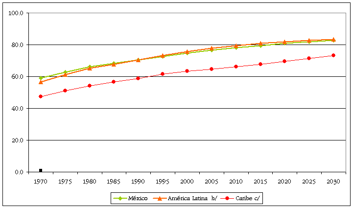 Porcentaje de población urbana en América por grandes regiones, 1970-2030 a/