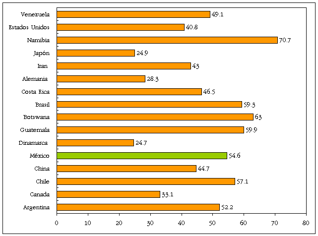 En Venezuela, Estados Unidos, Namibia, Japón, Italia, Alemania, Finlandia, Costa Rica, Brasil, Guatemala, Dinamarca, Chile, Canadá y Argentina se refiere a los porcentajes de ingreso por percentiles de la población.