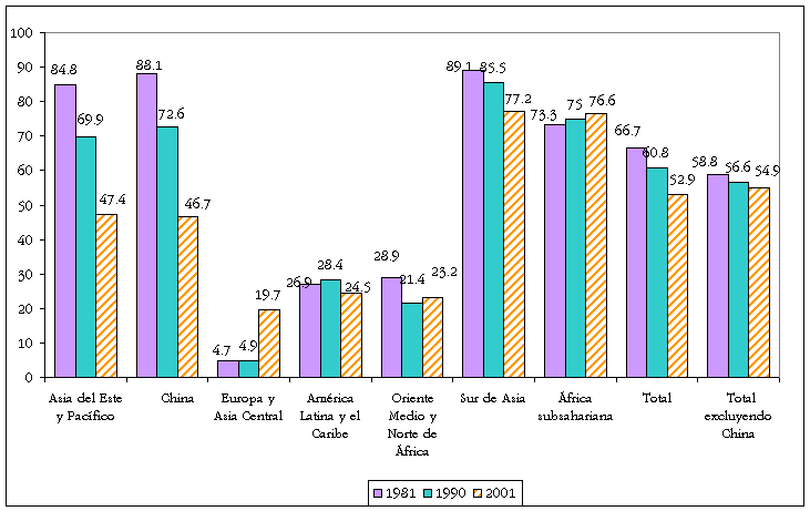 Personas viviendo con menos de dos dólares al día (porcentaje), 1981-2001