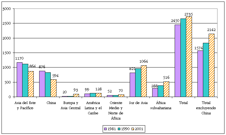 Personas viviendo con menos de dos dólares al día (millones), 1981-2001