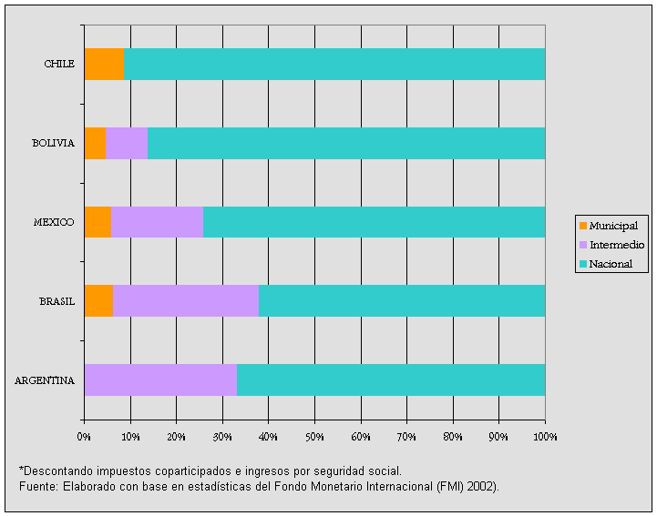 Participación en ingresos fiscales*, por niveles de gobierno en paises seleccionados, 1992-2001