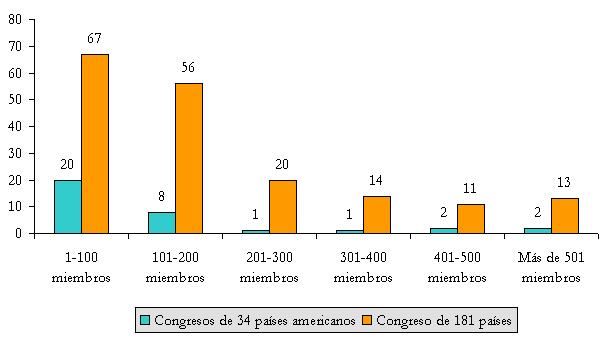 Fuente: Cuadros realizados con la información de la Unión Interparlamentaria, base de datos Parline, Naciones Unidas, Estados Unidos, 2006, en: www.ipu.org/parline-e/parlinesearch.asp (Consulta: 14 agosto 2006) Comparación entre los 34 países americanos y los datos de 181 países. De los 34 países comparados Cuba (609) y Brasil (513) son los países con más legisladores, después le siguen México con 500 miembros y Estados Unidos con 435.