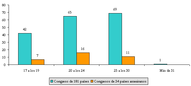 Fuente: Cuadros realizados con la información de la Unión Interparlamentaria, base de datos Parline, Naciones Unidas, Estados Unidos, 2006, en: www.ipu.org/parline-e/parlinesearch.asp (Consulta: 14 agosto 2006). Comparación entre los 34 países americanos y los datos de 181 países. México está en la segunda catogoría, ya que la edad mínima para ser Diputado son los 21 años.