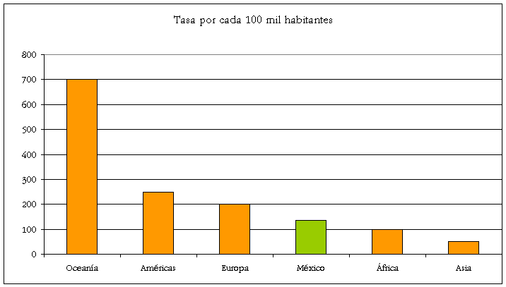Robo de auto. Tasas por cada 100 mil habitantes en México y regiones del mundo (2002)