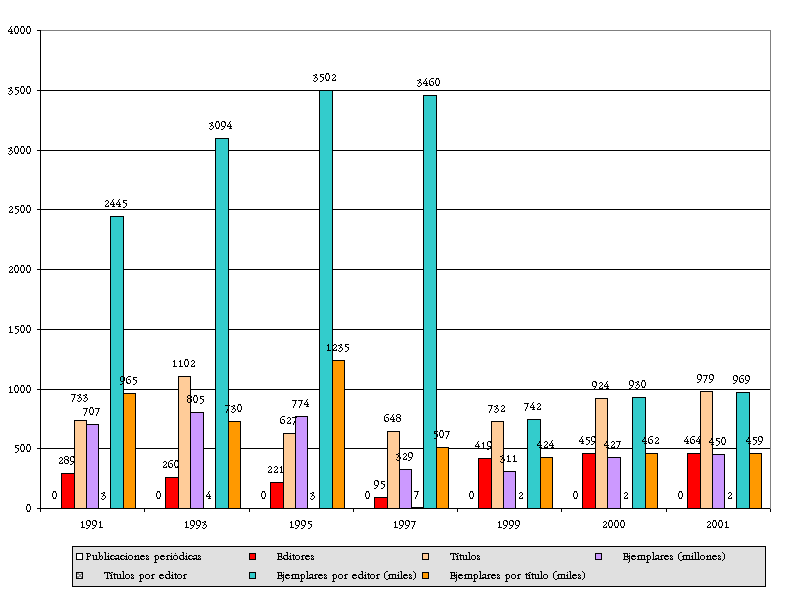 Fuente: Para 1991 a 1997: INEGI. Estadísticas de Cultura. Para 1999 a 2001: CANIEM. Actividad editorial CANIEM. Sector Libros 2000 y 2001. México, D.F., 2002.