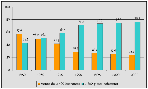 Distribución porcentual de la población total según tamaño de localidad, 1950 a 2005