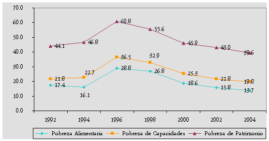 Las cifras de pobreza correspondientes a los años 2000, 2002 y 2004 se obtienen al mantener fijo el coeficientes de Engel al año 2000. Por tal motivo, las cifras del año 2002 difieren de las reportadas en informes anteriores.