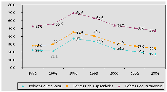 Las cifras de pobreza correspondientes a los años 2000, 2002 y 2004 se obtienen al mantener fijo el coeficientes de Engel al año 2000. Por tal motivo, las cifras del año 2002 difieren de las reportadas en informes anteriores.