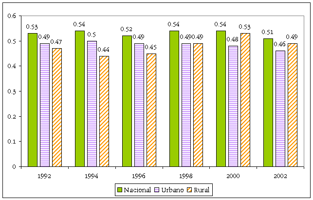 México. Coeficientes de Gini, 1992-2002. Nacional, urbano y rural.