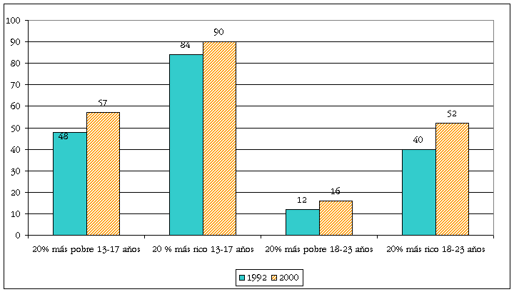 Tasas de matriculación de jóvenes en hogares pobres y ricos de México, por grupos de edad, 1992 y 2000