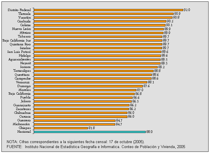 Porcentaje de la población de 5 a 15 años que asiste a la escuela por entidad federativa 2005