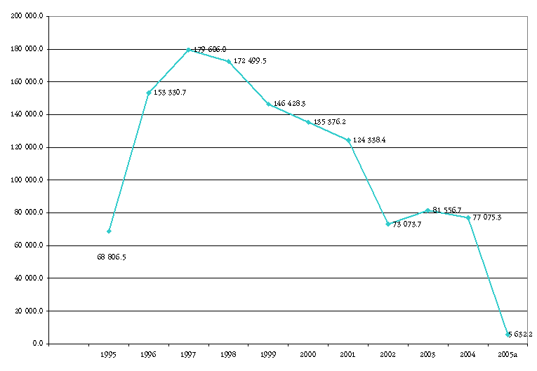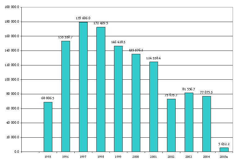 Asignación presupuestal por año de la vertiente productiva: Capital de Trabajo Solidario 1995-2005, del Fondo Nacional de Apoyo a Empresas en Solidaridad