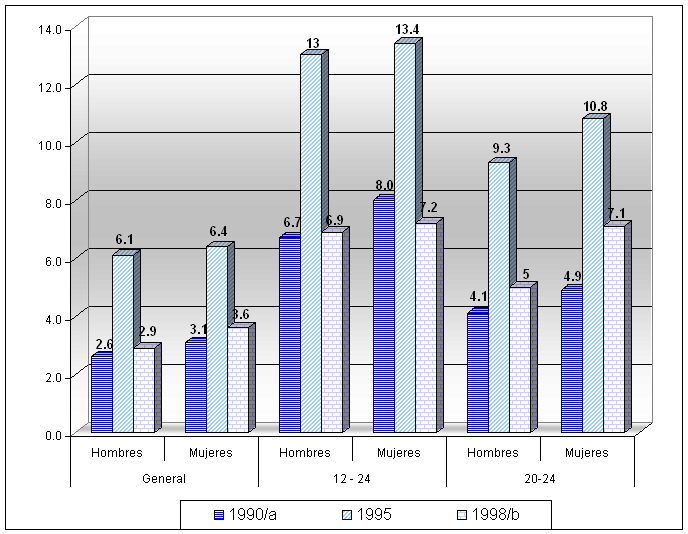 Tasa de desempleo abierto general en Adolescente/Joven por de edad y sexo 1990, 1995 y 1998