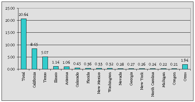 Población de origen mexicano residente en Estados Unidos, por estado de residencia 2000