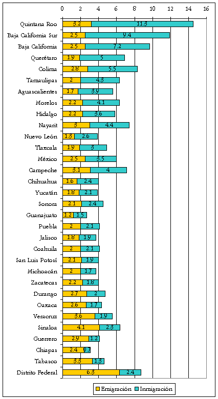 Porcentaje de emigrantes e inmigrantes internos respecto a la población de 5 años y más, 2005