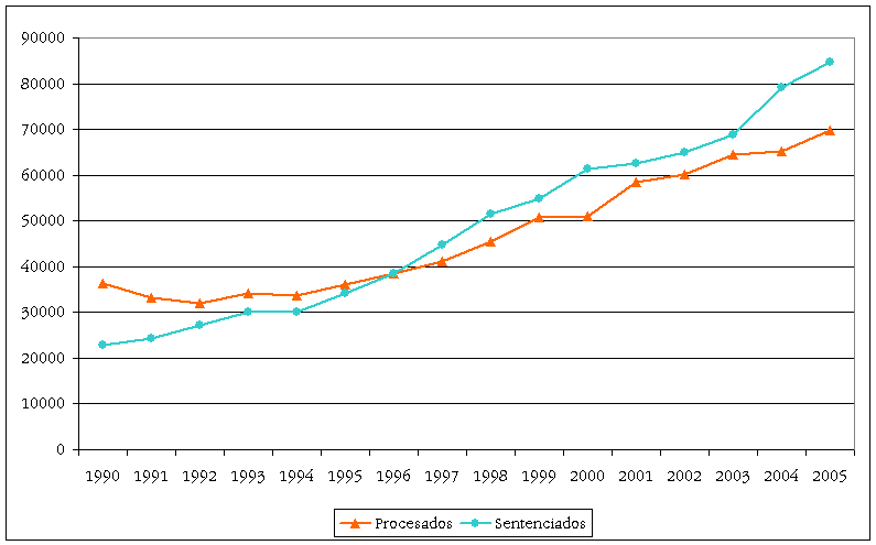Población penitenciaria del fuero común, según situación de su proceso (procesados y sentenciados, 1990-2005)