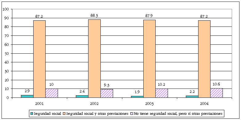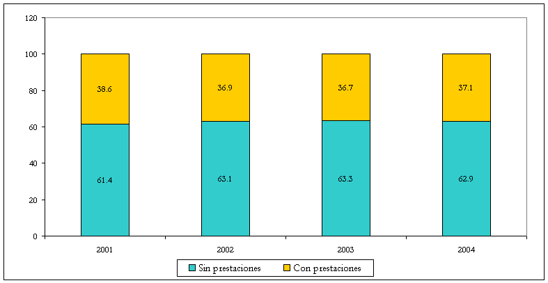 Distribución porcentual de la población ocupada según condición de prestaciones, 2001 a 2004