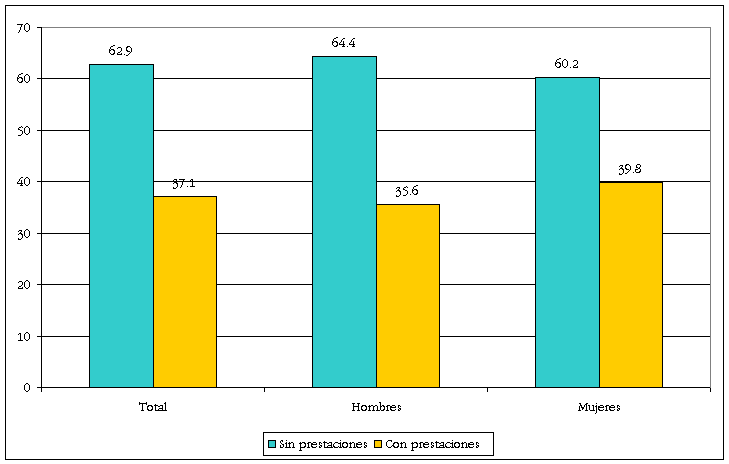 Distribución porcentual de la población ocupada según condición de prestaciones para cada sexo, 2004