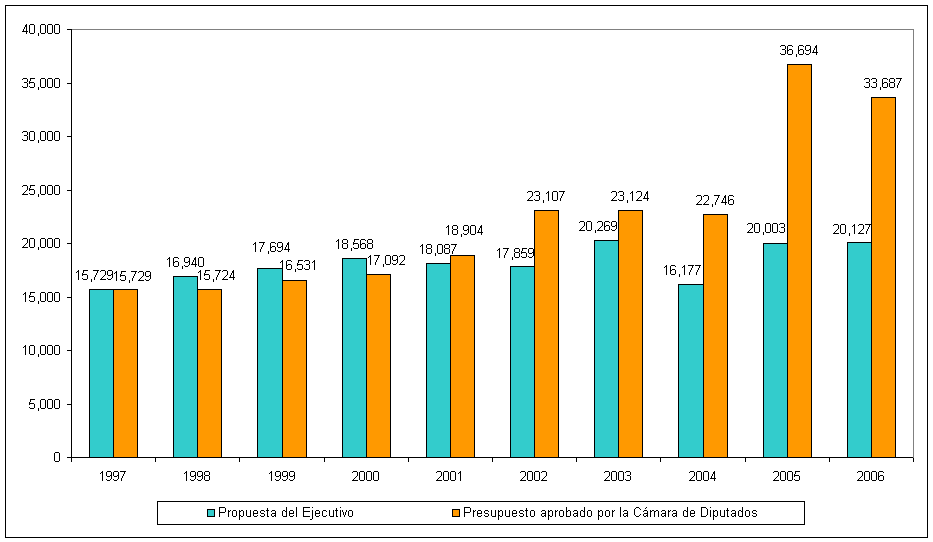 Elaboración con datos de Laura Sour, “Aprobación presupuestaria, la influencia del Legislativo en México”, Sistema de Información Pública Presupuestaria, SIPP, CIDE, Fundación Ford, 2006. Información en disco compacto. Valores expresados a precios corrientes.