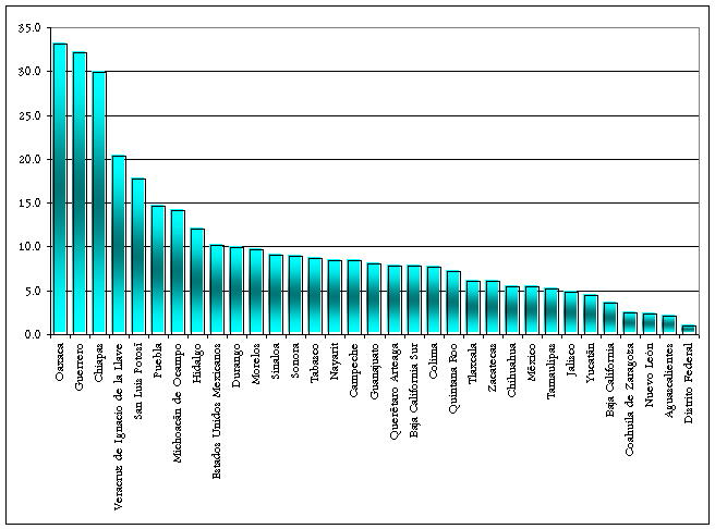 Porcentaje de viviendas particulares con piso de tierra por entidad federativa, 2005